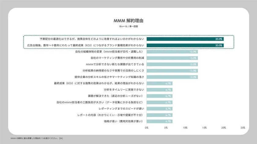 c. 「MMMで分析できない新たな課題が出てきている」と回答した対象者に対してMMMで解決できない課題について聞くと、「予算配分の最適化はできるが、施策自体をどのように改善すればよいのかがわからない(20.0%)」「広告出稿後、数年~十数年にわたって最終成果(KGI)につながるブランド蓄積効果がわからない(20.0%)」がTOP2に挙がった。分析結果を得たあとに具体施策へ落とし込むフェーズと、ブランド蓄積効果の可視化に新たなマーケティング課題があると考えられる。
