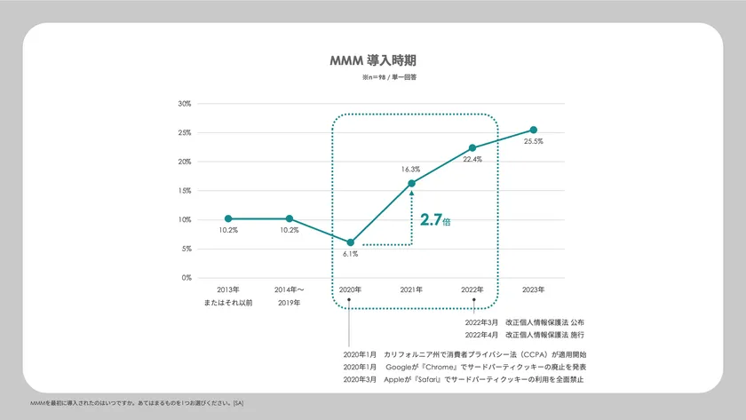 b. 次に、本調査にてMMMの導入経験者にMMMの導入時期を聞くと、2020年の導入者が6.1%なのに対し、2021年は16.3%と約2.7倍になっており、2021年にMMMの導入数が急増したことがうかがえる結果となった。2020年にGoogle、Appleがサードパーティクッキー廃止を発表し、2022年3月には日本でも改正個人情報保護法が公布されたことで、サードパーティクッキーの代替手段としてMMMを導入・検討する層が増えたことが増加の要因の一つと推測される。MMM導入数は2022年以降も増加傾向にあり、MMMの市場自体は拡大傾向にあるものの、認知・導入状況を合わせて見ると、マーケティング業界全体にはいまだ十分に浸透していないことがわかる。
