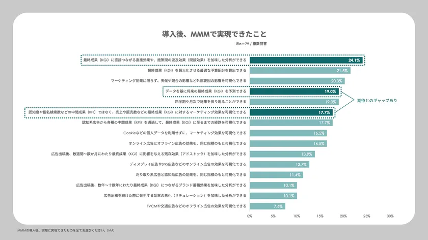 c. さらに、MMM導入経験者に、MMM導入によって実現できたことを聞いた(*3)。上の「MMMに期待したこと」と比較すると、「最終成果(KGI)に直接つながる直接効果や波及効果(間接効果)を加味した分析ができる(24.1%)」は一定実現できているように見える。一方、「データを基に将来の最終成果(KGI)を予測できる(19.0%)」と「認知度や指名検索数などの中間成果(KPI)ではなく、売上や販売数などの最終成果(KGI)に対するマーケティング効果を可視化できる(17.7%)」は、期待に対して多少の落ち込みがあった。