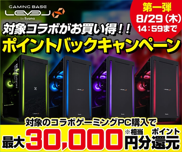 パソコン工房・グッドウィルを運営する株式会社ユニットコム(代表取締役:端田 泰三、本社:大阪市浪速区)は、対象のLEVEL∞ コラボゲーミングPC購入で最大3万円分相当のポイントが還元されるポイントバックキャンペーンを8月16日(金)より実施いたします。