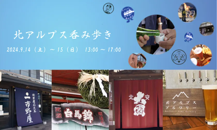 北アルプス呑み歩き実行委員会は3連休初日となる2024年9月14日(土)と15日(日)に、長野県大町市内の酒蔵などを自由に呑み歩くイベント「北アルプス呑み歩き」を開催いたします。2008年からコロナ禍の数年を除き毎年開催し、今年で14回目となる本イベントは、昨年までの名称「信濃大町三蔵呑み歩き」を「北アルプス呑み歩き」へと変更し、日本酒の酒蔵3軒に地元のブルワリー1軒も加わってよりパワーアップ。大町市の様々な飲料や食品、観光コンテンツなどとコラボレーションし、地域の魅力を広く発信していくイベントに拡大し、各蔵ではキッチンカーも出店いたします。