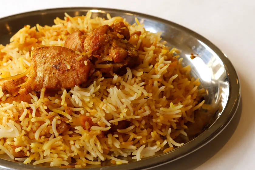 スパイスやハーブとともにヨーグルトでマリネした鶏肉に、細長いお米「バスマティライス」を重ねて炊いたインドのごちそう炊き込みご飯。