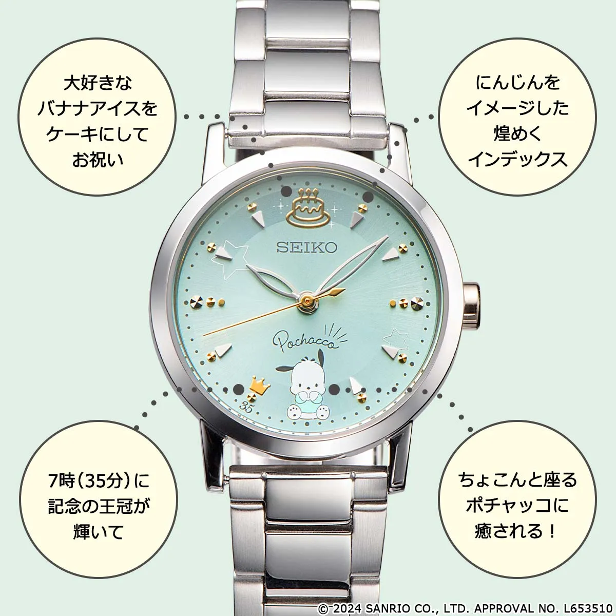 12時にはポチャッコが大好きなバナナアイスのケーキ。キラキラと煌めくインデックスはにんじんをイメージ。7時(35分の位置)には35周年を記念した王冠が輝いています。