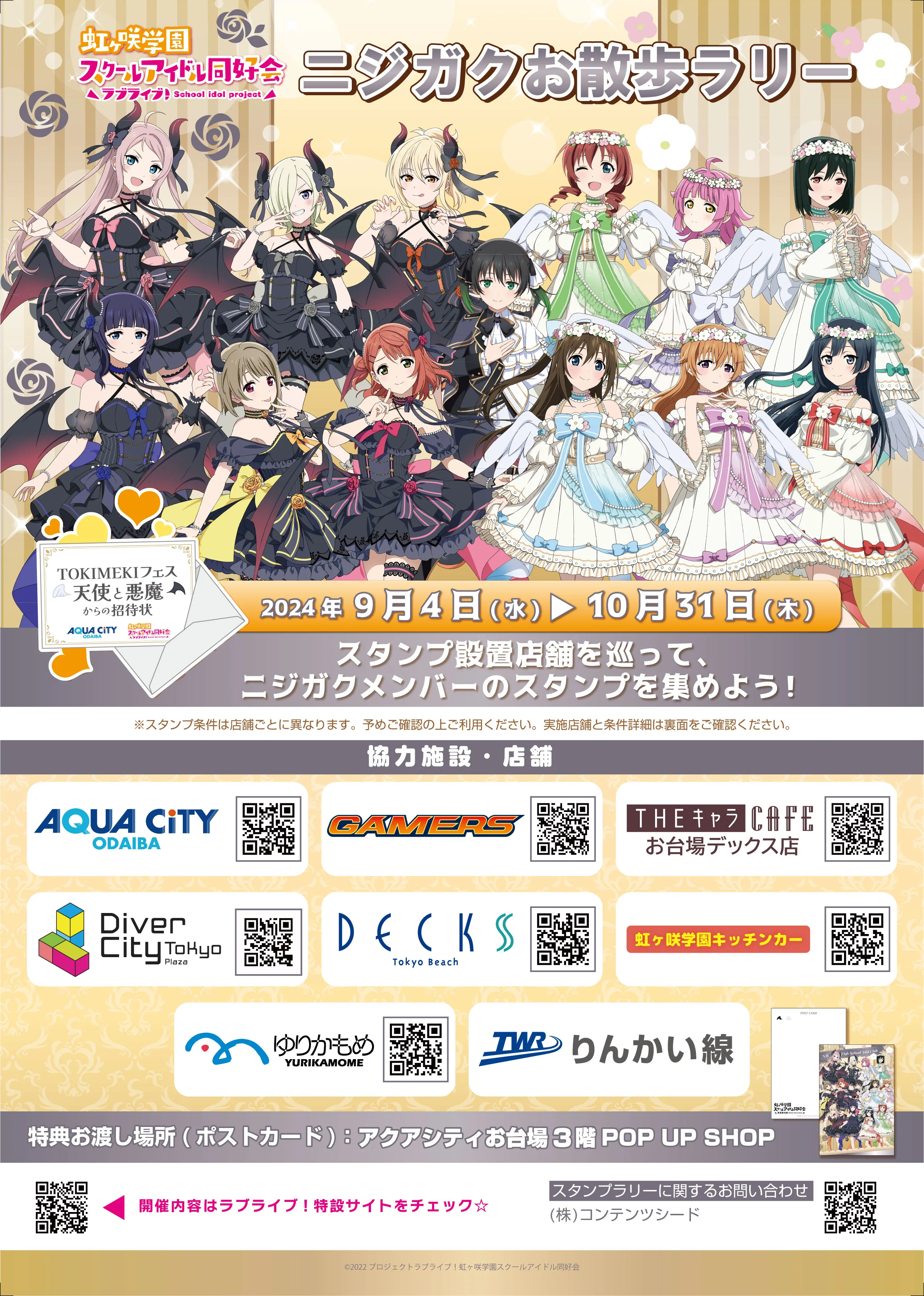 本コラボ企画限定で、天使と悪魔の衣装を身に纏ったニジガクメンバーの描き下ろしスタンディ(13種)と、天女の衣装を身に纏ったニジガクメンバーの描き起こしスタンディを館内各所に展示します。またニジガクメンバーの中須かすみ・優木せつ菜による館内アナウンス放送も実施します。アクアシティお台場の館内全体で、「TOKIMEKIフェス 天使と悪魔からの招待状」の世界観をお楽しみいただくことができます。