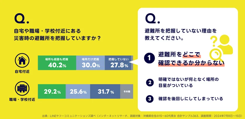 当社が実施した沖縄県民を対象にしたインターネット調査によると、自宅・職場・学校付近の避難所の「場所も経路も把握している」と回答した人は約30~40%にとどまりました。把握していない理由で最も多かったのは、「避難所をどこで確認できるかわからない」というものでした。以上の結果を踏まえ、本プロジェクトを通じて平常時から自分の生活圏内の避難所とその経路を確認する機会を創出したいと考えています。