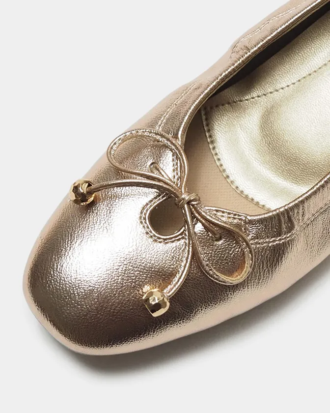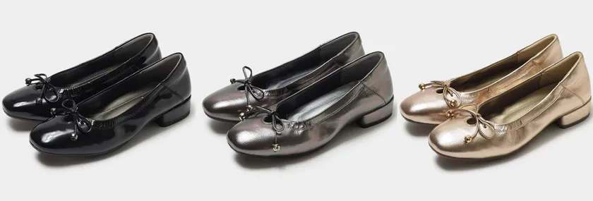 「撥水ソフトストレッチリボンバレエ」は、踵やつま先にあえて硬い芯を入れないやわらか仕上げ。少し深めのシャーリングゴム入りの履き口によって、やさしいホールドを感じられます。リボンは細めでさりげないあしらいです。揺れる多面カットの紐先飾りがアクセントになっており、アッパー素材を傷つけない仕様になっています。また、甲の部分のティアドロップ型の開きが女性らしい抜け感を演出します。