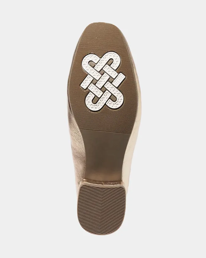 軽量ラバーのソールには、「お客様とのつながり」を2つのハートで表現したエンブレム入り。このエンブレムは、歩行時の防滑性を高めています。ヒールは安定感のある広い接地面で、コツコツ音がしない消音リフトです。また、リフト交換も可能なので、長くご愛用いただけます。撥水ソフトストレッチモカシンには、ビジューラインの飾りウェルトを施しています。