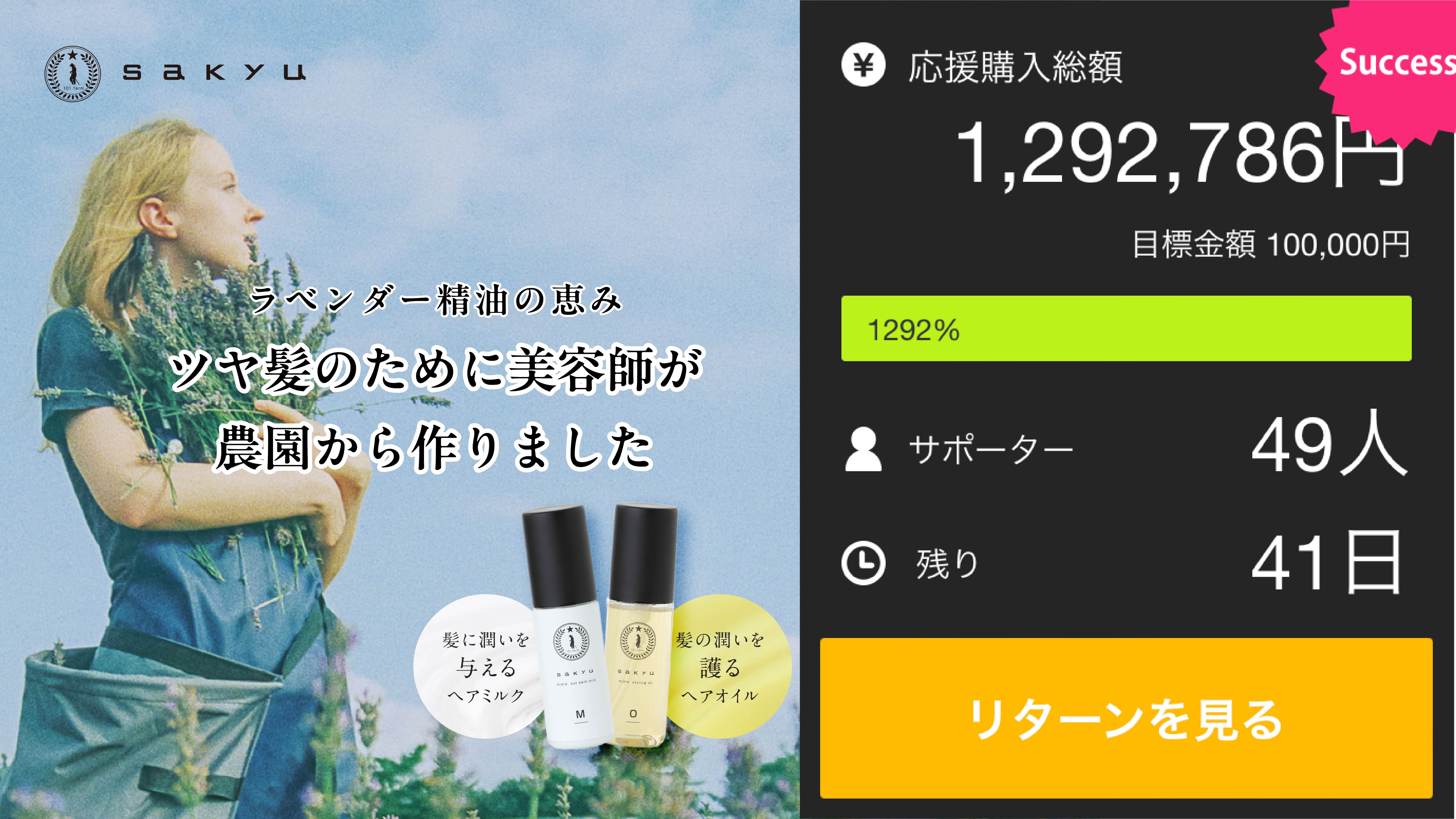 さらに、同日より公開された初挑戦のプロジェクト『Makuake』においては、「sakyu」の想いにご賛同いただいた方の応援購入にて、初日で目標金額を達成いたしました。