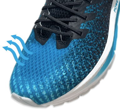 ミッドソールには、中足部着地にも適したカーブ形状の「3Dパワーカーボン」を内蔵。カーボン繊維の積層角度を調節し、ランナーレベルに適した剛性としなり具合を実現。さらに力のかかる親指部まで搭載部を伸長しました。
