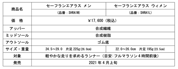 高いクッション性などの機能を備えながら、軽量性を追求したセーフランエアラスは、フルマラソンを4時間前後で走る(sub4)ランナーを対象としています。