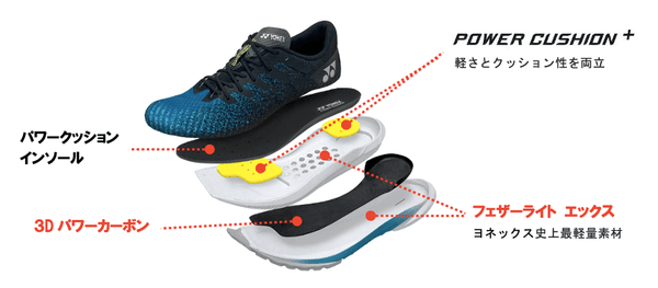 また、ミッドソールには中足部着地に適するカーブ形状の「3Dパワーカーボン」を内蔵、ランナーレベルに適した剛性としなり具合を実現しています。そして今回、新たに採用したヨネックス史上最軽量※1のミッドソール素材「フェザーライト エックス」は、一般的なEVA材より約30%※5、軽量素材からも約12%※6の軽量化を実現。