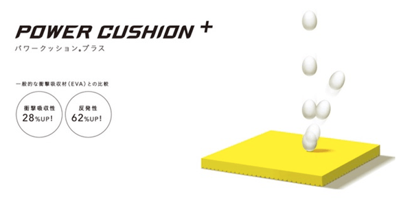 衝撃吸収性と反発性を併せ持つ「軽く、疲れにくい」衝撃吸収反発素材パワークッション。パワークッションに反発性の高い特殊樹脂を添加し、+型の溝を最適な間隔と深さで格子状に配置した新構造を採用した「パワークッション®️プラス」は、従来の軽量性を保ちつつ、衝撃吸収性を28%※1、反発性を62%※2アップさせ(一般的な衝撃吸収材[EVA]との比較)、12mの高さから落とした生卵が、割れずに6m以上跳ね返る※3衝撃吸収反発素材です。