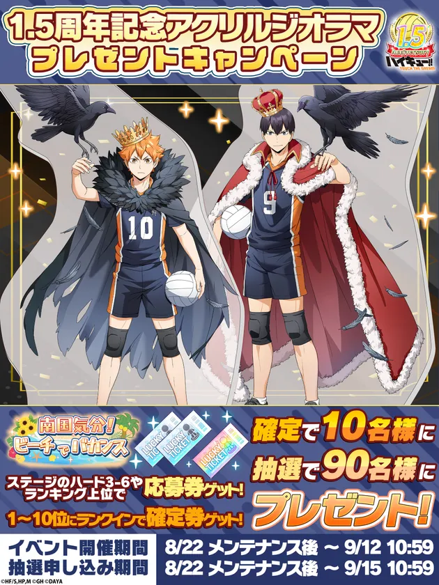 ゲーム内で8月22日から開催する限定イベント、「バカンスステージ」と連動したスペシャルなプレゼントキャンペーンを開催!一足早く登場しているピックアップガチャ「王冠」の日向翔陽と影山飛雄のアクリルジオラマを合計100名様にプレゼントいたします!