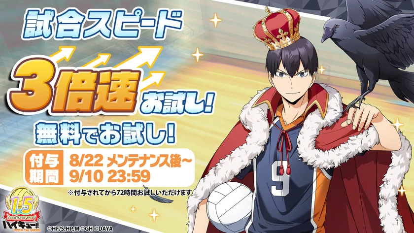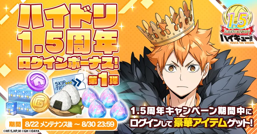 株式会社Gホールディングスは、アニメ『ハイキュー!!』のスマホゲーム『ハイキュー!! TOUCH THE DREAM』略称『ハイドリ』の1.5周年を記念して、2024年8月22日(木)から1.5周年キャンペーンの開催と、2024年8月27日(火)20時30分からスペシャルなゲストをお迎えした、1.5周年記念生放送を実施いたしますことをお知らせいたします。
