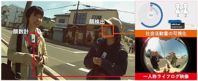 ここではその一例として、私たちの開発してきた顔数計(かおすうけい)を紹介します。顔数計は胸に装着するカメラデバイスで、その名の通り、対面する人の顔の数を数えます。歩数計が歩数を数えることで装着者の大まかな身体活動量を数値化するように、顔数計は装着者の社会活動量を数値化することを意図してます。