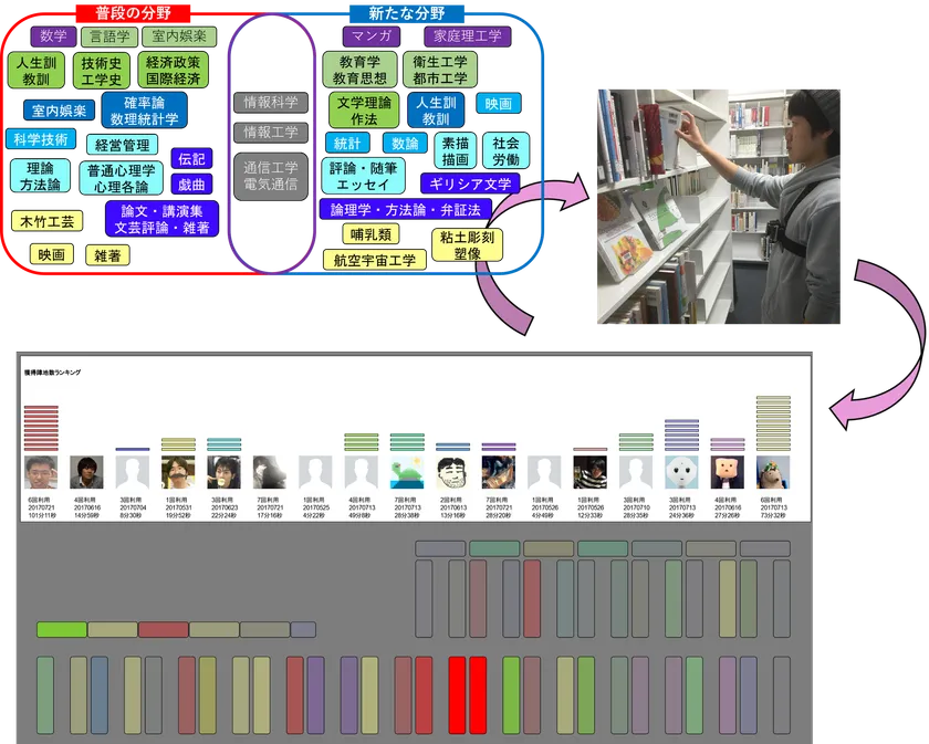 ゲームの勝ち負けは獲得陣地の数、つまり獲得した棚の数で決まります。ですから、激戦地にこだわらずに他のプレイヤーの滞在時間の短い(つまり人気の無い)棚に滞在すればたやすく新しい陣地を増やすことができます。そのような行動はゲームプレイヤーとしては合理的ですが、教育的な意義からはかけ離れている、と考える人も多いことでしょう。しかしあにはからんや、動機は何であれしばらく覗いてみればつまらない棚などないのです。普段は立ち寄らない棚にしばらく立ち止まってみると、意外に面白そうな本に出会うことがあり、そのことがプレイヤーたちの興味の世界を拡げてくれます。その証拠に、図の左上に示したように、プレイヤーたちの本の貸出記録からは、ゲーム参加によって貸出本の分野に変化が現れているのがわかります。