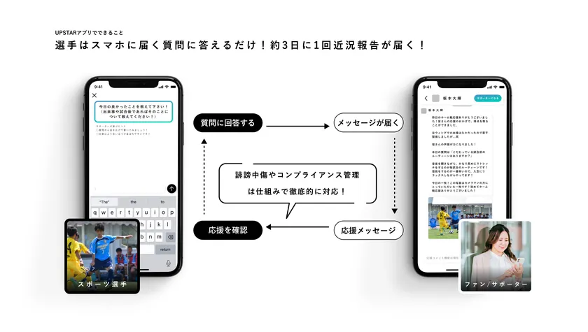 UPSTAR(アップスター)は、現役スポーツ選手(プロからアマチュアまで)とファン・サポーターを繋げるファンコミュニティスマホアプリです。