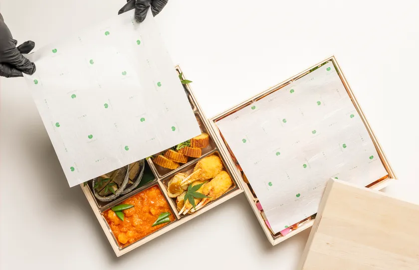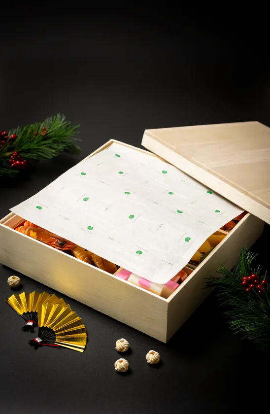 「ワサガード抗菌シート」は、おせちやお弁当の上に1枚のせるだけで、ワサビやカラシの成分で食品を守ります。食中毒の原因になる菌の増殖を抑制し、鮮度を保持します。