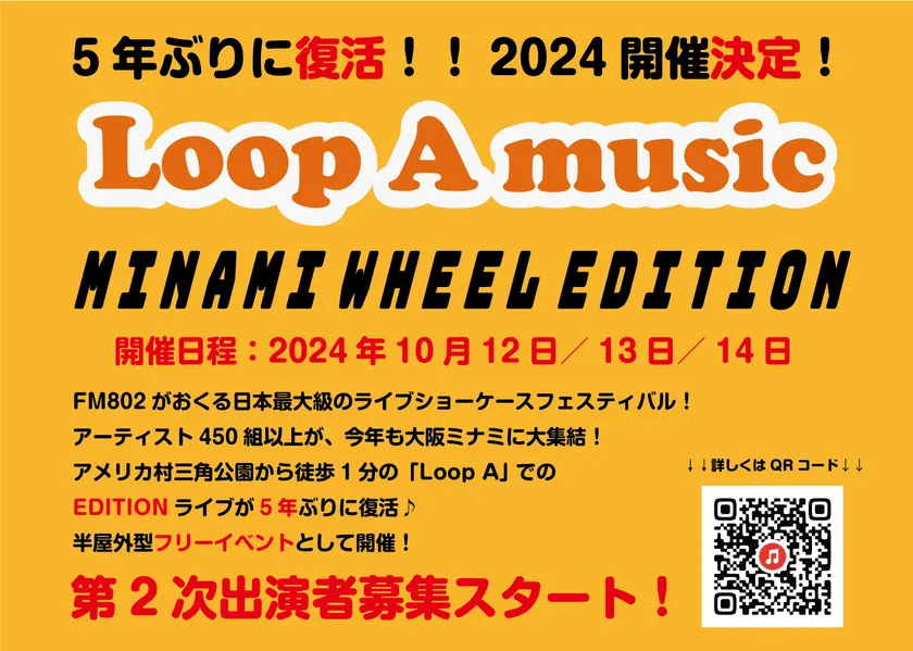 5年ぶりに復活!ライブショーケース 「Loop A music MINAMI WHEEL EDITION 2024」 阪神高速ミナミ交流プラザ「Loop A」にて10月12日~14日開催