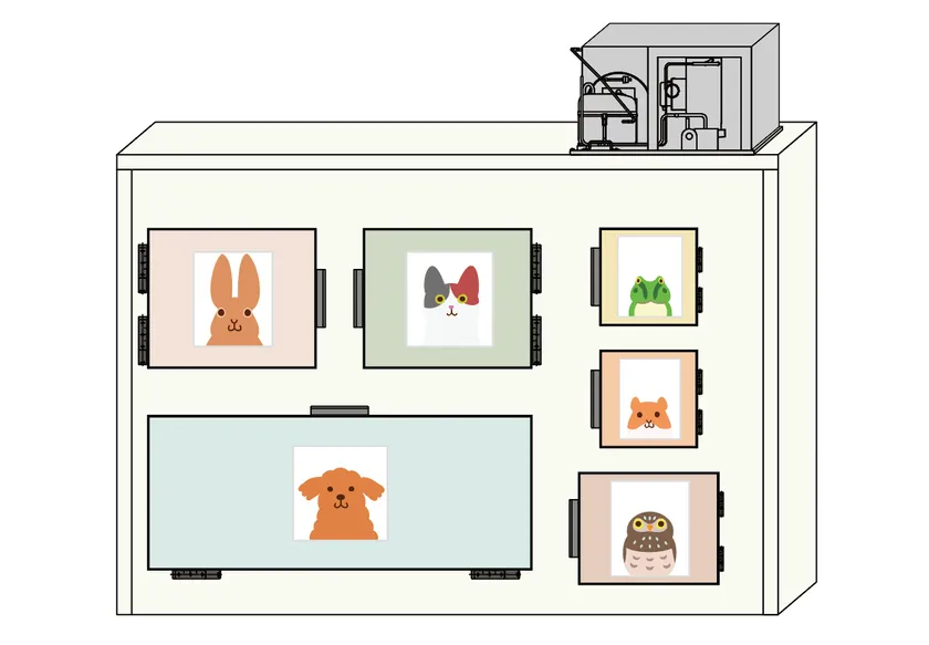 家庭用のペットで代表的な、犬、猫はもちろん、インコなどの小型鳥類、小動物(うさぎ、フェレット、ハムスターなど)、そして水生生物(観賞魚、かめ、ウーパールーパー、蛙など)、あらゆるペットのご遺体を大切に保管し、葬儀まで最適な環境で安置する機能を備えています。