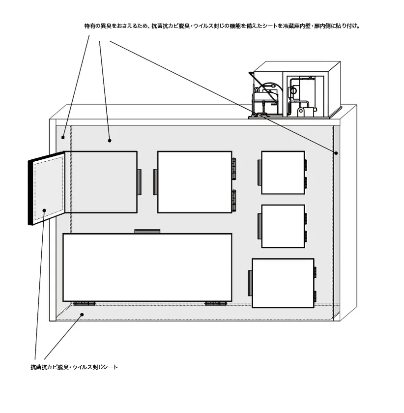 3. 特有の異臭をおさえるため、抗菌抗カビ脱臭・ウイルス封じの機能を備えたシートを冷蔵庫内壁に貼り付けています。