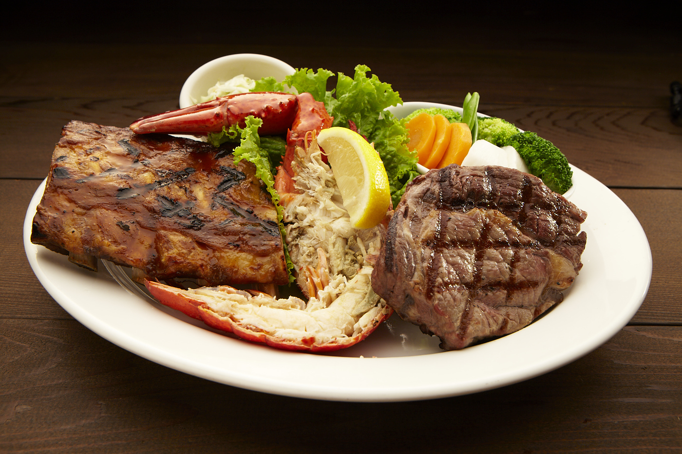 贅沢に一尾丸ごとスチームしたカナディアンロブスターとバーベキューリブのコンビネーションプレート。