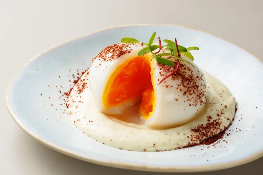 ウフマヨは、ウフマヨネーズの略称で、ゆでた卵にマヨネーズなどのソースをかけて食べる伝統的なフランス料理です。今回は中東風にアレンジ。マヨネーズは、豆乳、塩麹、クミン、コリアンダー、カルダモン、レモン汁で作った豆乳マヨネーズに。仕上げにスマックとマイクロマリーゴールドを添えて。