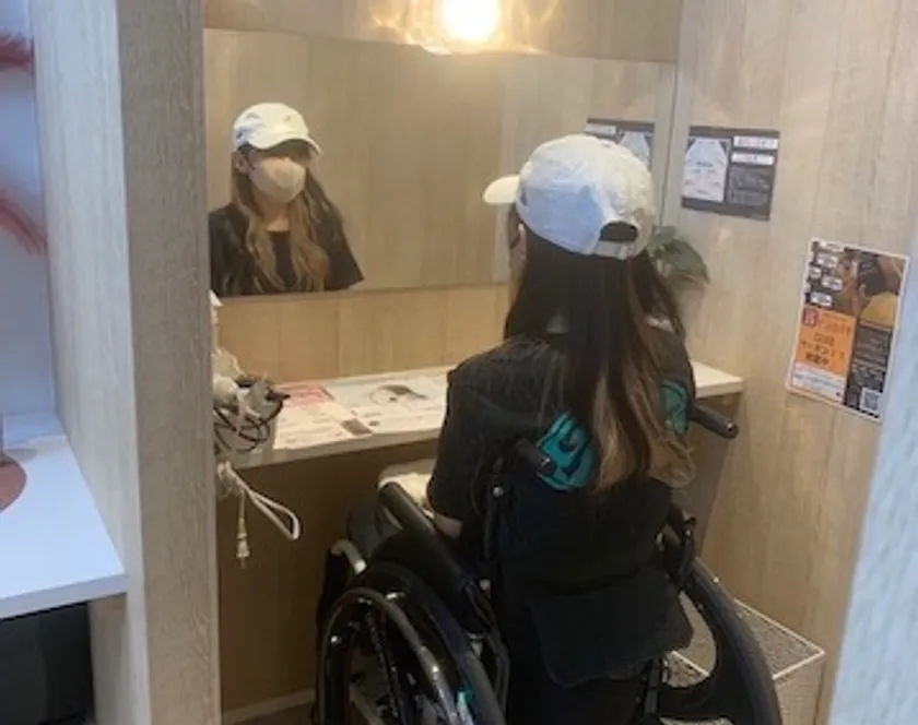 「車イス駐車場もあるので、車でも来やすく、お店までの道も段差がないのでスムーズに来れるのがありがたいです。店内もバリアフリーが整っているので、すごく良いです。通路が広いので、他のお客様とのすれ違いもしやすいし、ドレッサーの高さも、車イスのままでも使いやすいので、終わったあとの身支度もできるのがうれしいです。