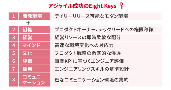 今後、DASAアンバサダーに就任した3名は、DASAのバリューボックスとSHIFTが提唱するアジャイル変革フレームワーク「Eight Keys」をコラボレーションさせることで、ビジネスアジリティと品質保証を軸に、顧客と社会の変革に伴走します。「開発」、「組織」、「経営」、「マインド」、「文化」、「コミュニケーション」、「評価」、「採用」で構成されるEight Keysを通じて、国内外のDevOps/アジャイルコミュニティへの発信・貢献を加速されます。