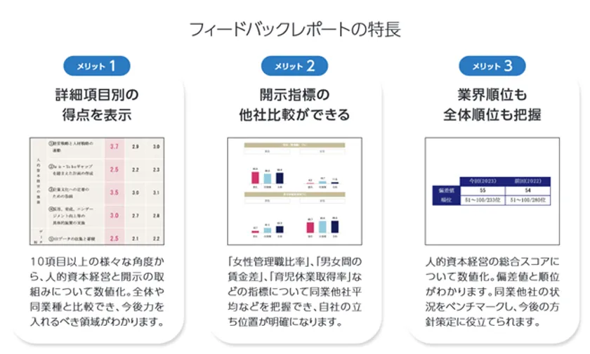 自社の人的資本取組状況を簡易診断したフィードバックレポートを無償でご提供します。自社の課題把握や今後のさらなる推進に向けてご活用いただけます。