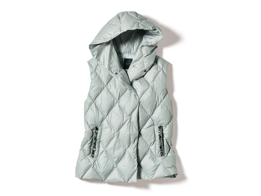 ダウンベストは、シルキーな風合いとはっ水性を備えた高密度素材を使用。優しいペールグリーンが、着る人の繊細な美意識を感じさせます。ポケット口には存在感のあるビジューを手作業で施したグログランテープで華やかさをプラスしました。