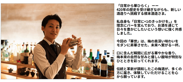 茨城県にて420年にわたり酒造りを続ける根本酒造(所在地:茨城県常陸大宮市)は、創業の歴史における新たな事業再興の第一歩として、前代未聞の高級梅リキュール「華世 / Kaséi」の開発にチャレンジし、Green Fundingにて先行販売を開始いたしました。