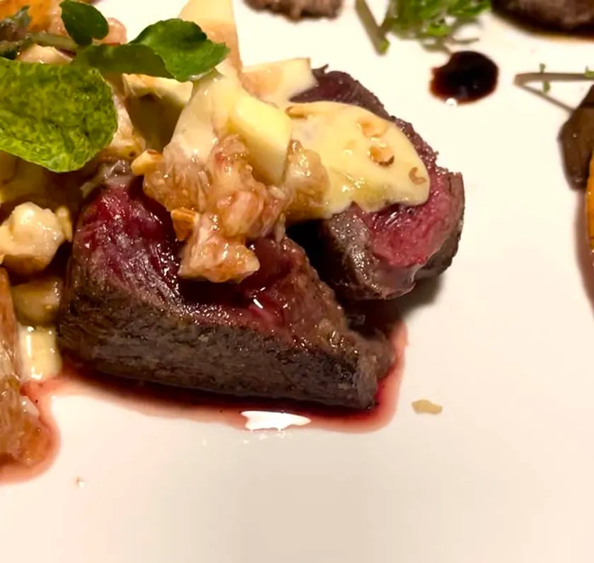 *叫ぶほど美味しい鹿のローストブルーチーズソースと無花果ナッツ添え