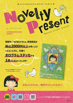 期間中、「ちびまる子ちゃん」関連商品を税込2000円以上お買い上げいただいた方に先着で「ホログラムステッカー」を1枚プレゼントいたします。