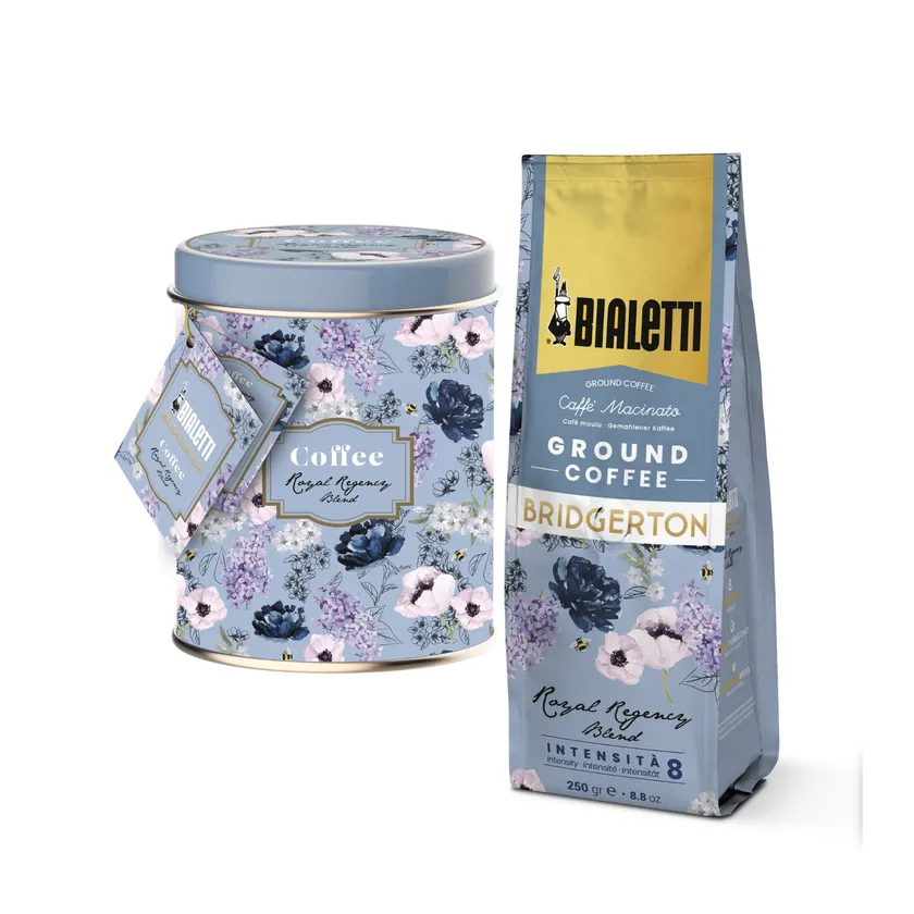 「ブリジャートン家」は、華やかな19世紀初頭のロンドン社交界を舞台にした、名門貴族のブリジャートン家の8人兄弟がそれぞれの愛と幸せを追い求める姿を描いたストーリーで、視聴者を魅了しています。一方で、ビアレッティは1933年の「モカエキスプレス」発売以来、イタリアの家庭で愛され続けるコーヒーの代名詞となっています。この度のコラボレーションでは、ドラマのエレガンスとビアレッティの伝統が美しく調和した限定アイテムが誕生しました。