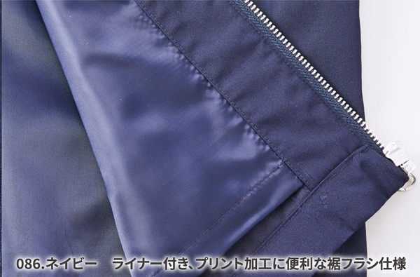 表地は、ポリエステルの耐久性と綿の快適性を兼ね備えた型崩れの少ないT/Cウェザー。裏地は身生地と同色で、プリントをおこなう際の加工板が入るふらし仕様となっています。
