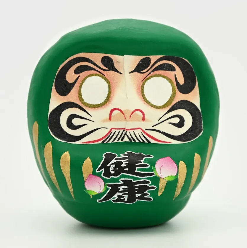 様々な願意の中で最も人気の「健康」を祈願するだるまさんです。お腹には古来からの魔除けのシンボルである「桃」を配し、背中には「無病息災」と書かれています。