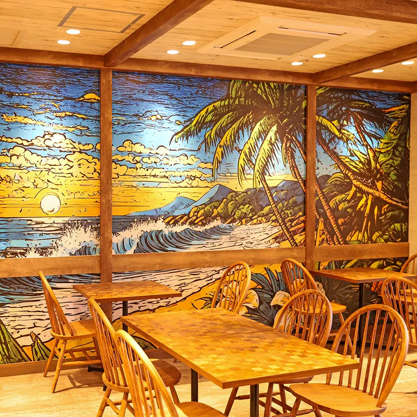 店内は、ゆったりとしたソファー席、外の景色を楽しめる半テラス席などをご用意。駅直結立地ながらハワイにいるかのようなリゾート気分を味わっていただけます。