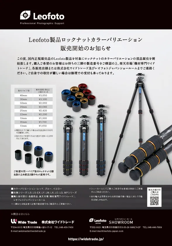 購入希望者は自身のLeofoto三脚の製造番号を確認の上、各販売店または株式会社ワイドトレード及びレオフォトジャパンショールームまで連絡ください。