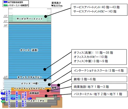 また、本社機能を構えるのにふさわしい規模を誇るオフィス、そして、オフィスワーカーや来街者の利用に資する商業施設、「東京ミッドタウン八重洲」等の地下と接続され一体で運営されるバスターミナル、エンターテインメント機能として八重洲エリアに賑わいを創出する劇場に加え、外国人を含む多様な滞在ニーズに対応した上質なサービスアパートメントや、外国人の子供達に世界トップレベルの教育を提供するインターナショナルスクールが集積することで、東京駅前に新たな賑わいを創出し、東京の国際競争力強化に貢献します。