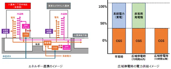 本事業では、建物内に非常用発電機と常用発電機であるコ・ジェネレーションシステム(以下、「CGS」)を整備し、電気と熱供給事業を行います。「東京ミッドタウン八重洲」内に設置されているCGSと連携することで、エネルギーの効率的な運用による環境負荷の低減を図ると同時に、本建物の省エネルギー化を推進し、事務所用途における「ZEB ready」認証取得を目指します。停電時には、ガス供給が継続する限り、72時間は平常時電力100%、72時間以降も平常時電力50%の電気供給が可能であり、入居企業のBCPをサポートします。さらに本建物内に整備される帰宅困難者の一時滞在施設にも継続してエネルギーを供給する計画であり、八重洲エリアの防災機能を向上させ、安心・安全な街づくりに寄与します。