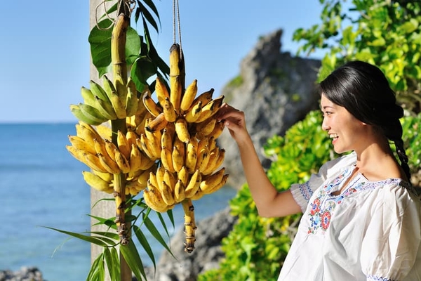 バナナは高さ3~5メートルになる大型の草本植物です。およそ80cmにもなる軸ごとのバナナが浜辺のマチャグワーに登場します。浜辺のマチヤグヮーでは店主に食べごろのバナナを見極めるポイントを聞き、熟していくにつれ緑から黄色へ変わっていくバナナを、収穫するかのように軸からもいで、もぎたての味わいを楽しむことができます。