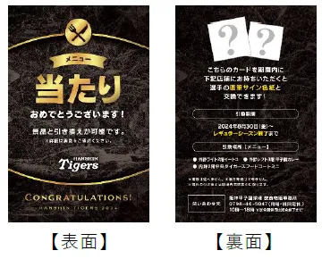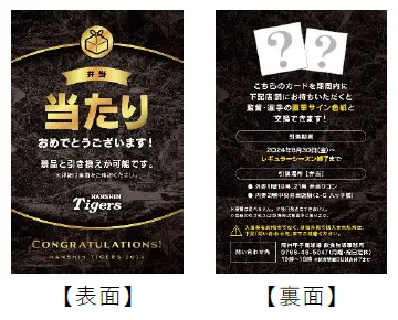 阪神甲子園球場内売店・ワゴン及び外周お弁当ワゴンで「監督・選手コラボグルメ」を1商品ご購入ごとに、阪神タイガースの監督・選手がデザインされた「限定カード(ノーマル:全24種、当たり:全2種)」のうち、1枚をプレゼントします。なお、「監督・選手コラボ弁当」と「監督・選手コラボメニュー」で、配布される「限定カード」が異なります。