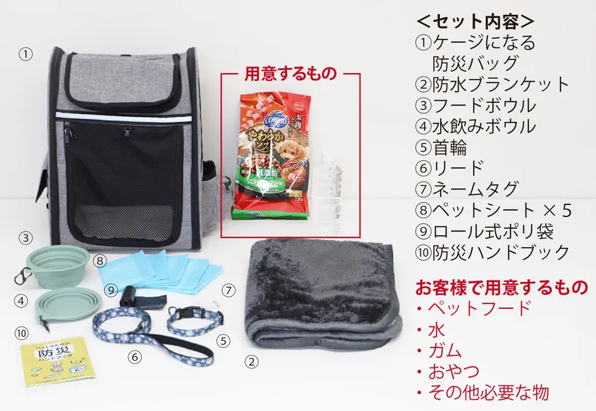 ペットが避難先で必要となる、必須アイテムをまとめた10点セットを作りました。ケージになる防災バッグは、避難時には防災用品を入れておくリュックとなり、避難場所に着いてからは拡張してペットケージとして使うことができます。防水のブランケットはケージ外で休憩するとき、ご家族と触れ合うときに活躍します。滑りやすい避難所の床からワンちゃんの脚をまもります。その他、トイレのためのペットシート、ごみを捨てるポリ袋などが入っています。
