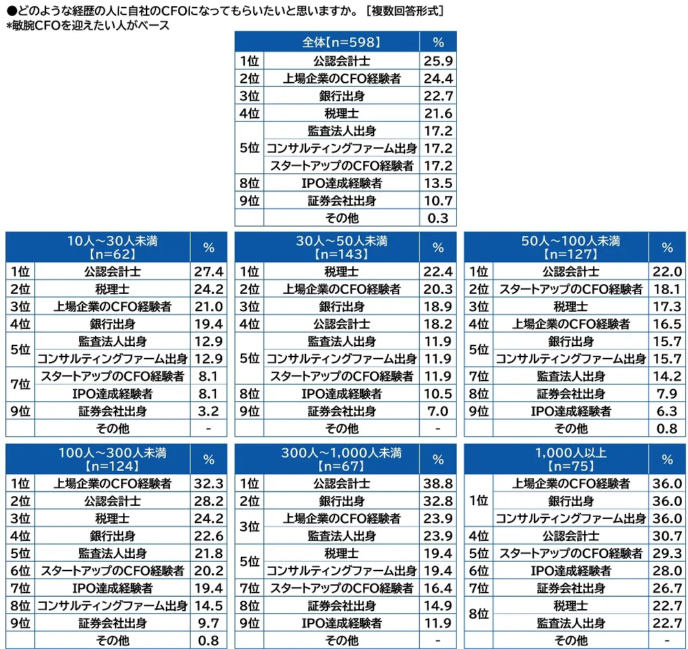 従業員規模別にみると、従業員規模50人未満では「税理士」(10人~30人未満20.5%、30人~50人未満19.2%)、従業員規模100人~300人未満では「上場企業のCFO経験者」(26.2%)、従業員規模1,000人以上では「銀行出身」と「上場企業のCFO経験者」(いずれも28.4%)がそれぞれ1位でした。