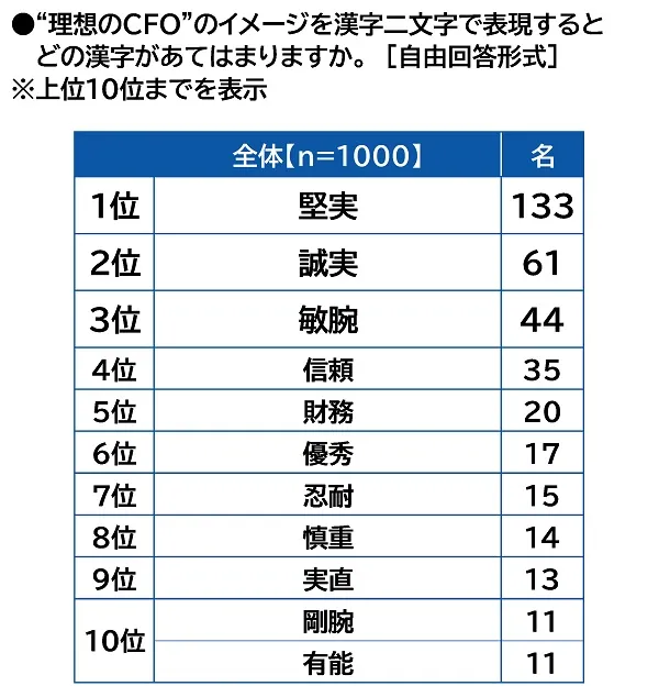 最後に、全回答者(1,000名)に、“理想のCFO”のイメージを漢字二文字で表現してもらったところ、1位「堅実」(133名)、2位「誠実」(61名)、3位「敏腕」(44名)となりました。危ない橋を渡ることがない、適切な財務戦略や事業戦略、適宜実施する資金調達のもと、CFOとして企業ビジョンの実現や事業計画の推進を手堅く着実に図れる人、CFOとして誠心誠意仕事に取り組みステークホルダーからの信頼が厚い人、CFOとして仕事で求められるスキルや能力が高く業務を素早く的確に処理することができる人といったイメージを持っている会社経営者が多いのではないでしょうか。