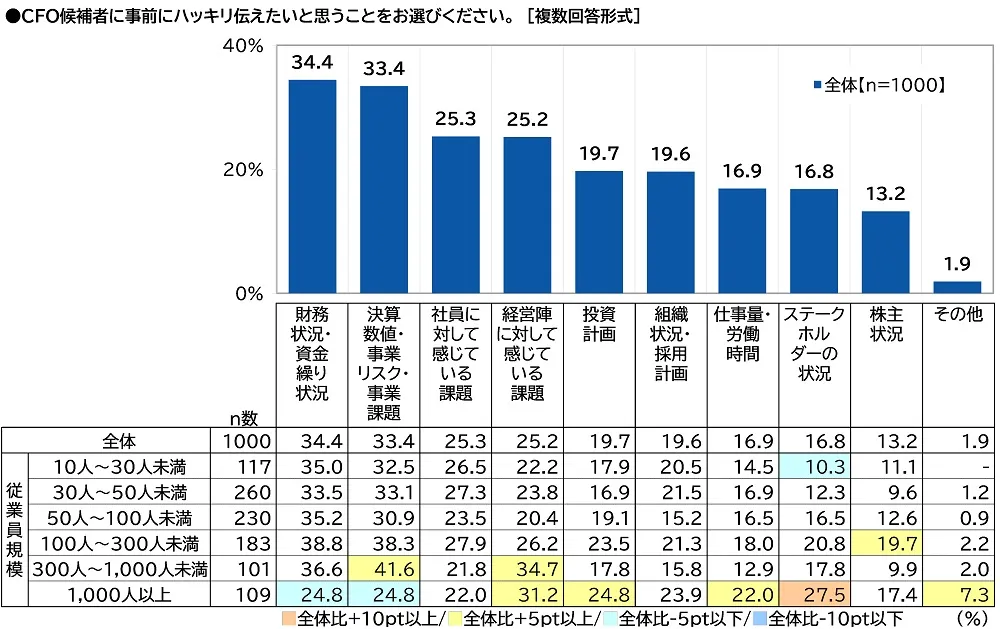 全回答者(1,000名)に、CFO候補者に事前にハッキリ伝えたいと思うことを聞いたところ、「財務状況・資金繰り状況」(34.4%)が最も高くなり、「決算数値・事業リスク・事業課題」(33.4%)が続きました。財務状況や決算数値、事業上のリスクや課題については、あらかじめ明確に伝えておくことで、就任後の業務遂行が円滑になると考えている経営者が多いのではないでしょうか。次いで高くなったのは、「社員に対して感じている課題」(25.3%)、「経営陣に対して感じている課題」(25.2%)、「投資計画」(19.7%)でした。