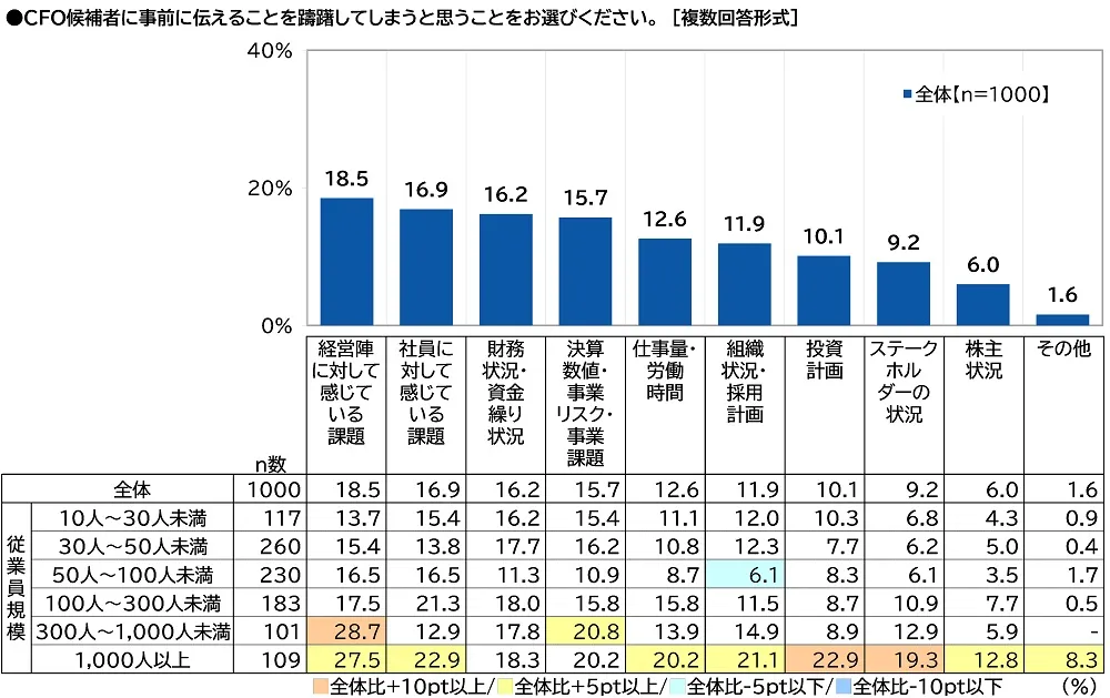 他方、CFO候補者に事前に伝えることを躊躇してしまうと思うことを聞いたところ、「経営陣に対して感じている課題」(18.5%)が最も高くなり、「社員に対して感じている課題」(16.9%)が続きました。次いで高くなったのは、「財務状況・資金繰り状況」(16.2%)、「決算数値・事業リスク・事業課題」(15.7%)、「仕事量・労働時間」(12.6%)でした。