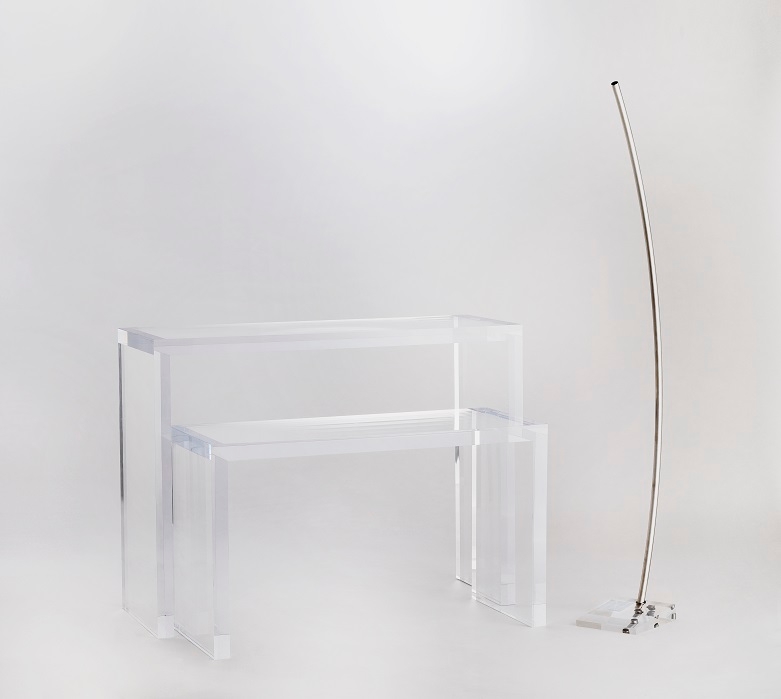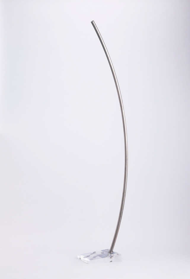 傾斜したアクリルベースに、美しく弧を描いたステンレスパイプが溶け込む、一点掛け ハンガーラック 「 Bow 」。