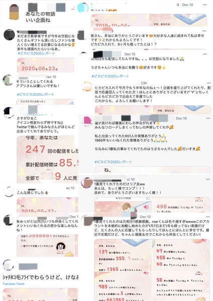 ユーザーたちは自分の2020レポートをSNSにシェアして、「いい企画」、「見て泣きました」、「アプリさん優しいね」、「みんなと出会ってよかった、来年も恩返しとしてピカピカでもっと頑張れたらいいなと思う」などといったたくさんの声をいただいた。#ピカピカ2020レポート のタグはアプリ内でもTwitterでも話題となり、ピカピカを知らない人にも注目されていた。